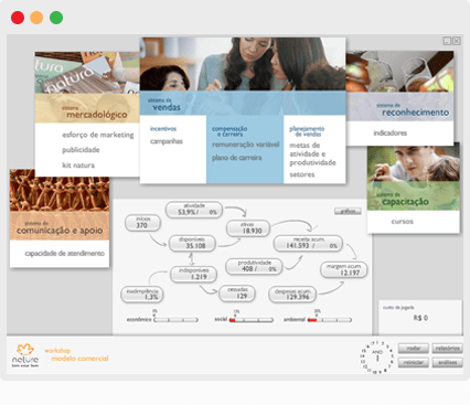 O simulador de vendas da Natura é uma ferramenta para capacitar novos colaboradores e a entender o particular modelo de venda direta da empresa, tomando decisões práticas e acompanhando seus impactos nos indicadores de desempenho.